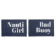 El Chica de Nauti Bad Buoy His White Script Nautical Pillow Funda presenta el divertido texto "Nauti Chica" y "Bad Buoy" en negrita y blanco con fondo azul. Un estupendo y divertido dormitorio con temática náutica. Diseñado por ©Evco Studio www.zazzle.com/store/evcostudio