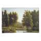 Este diseño presenta un cuadro del artista francés Jean-Joseph-Xavier Bidauld (1758-1846). Muestra un hermoso paisaje que rodea un lago en bote en un parque en Mortefontaine, al norte de Francia. El lago parece un río. Hay un barco en el agua con gente desembarcando. También hay cisnes nadando en el agua. Hay muchos árboles alrededor del lago. El cielo es azul brillante y contiene algunas nubes espesas blancas. La obra original fue pintada en 1806.
