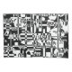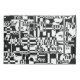 An abstract black-and-white composition featuring the names of Ethiopian cities written in Amharic, expressing urban diversity and cultural identity through layered typography and geometry.