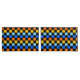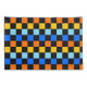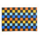 A vibrant checkerboard pattern featuring alternating rows of orange, yellow, light blue, and blue squares against a black background. The design is bold and energetic.
