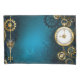 fondo turquesa, texturado, de vapor punk con bronce y oro, llave de plata y reloj. Estilo Steampunk.