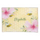 ¡Dulces sueños! Fondo amarillo y blanco con un patrón de peine de miel. Decorada con flores tropicales rosas, hibiscos y abejas felices con burbujas. Plantilla para su nombre. Texto con letras verdes a mano. ¡Perfecto para tu casa de verano! Atrás: sin ningún diseño