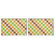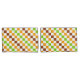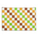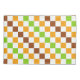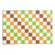 A vibrant checkered pattern of alternating green, orange, and brown squares on a white background. The design creates a lively, geometric feel.