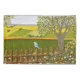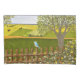 Un funda de almohadas con una hermosa imagen de la naturaleza: un pájaro sentado en una cerca meteorológica, flores silvestres creciendo alrededor de la cerca, un granjero en un tractor, trabajando su tierra, árboles con hojas y tierras de cultivo con varios colores. Obra de arte original de W.B.