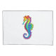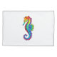 Arco de arcoiris, caballito de mar poligonal sobre fondo blanco. Tatuaje brillante.