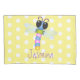 ¡Esta hermosa libélula azul y rosa es brillante y colorida! Dibujado en un estilo personalizado feliz sobre un fondo con motivos amarillos.