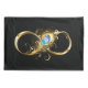 Oro, símbolo brillante de infinito, decorado con una pluma de pavo real de joyas con un fondo turquesa en negro.