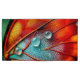 Esta impresionante fotografía macro capta el detalle impresionante de una ala de mariposa adornada con brillantes caídas de agua. El ala muestra un espectacular degradado de color, pasando de rojos feroces y naranjas vibrantes a un turquesa fresco y apacible. Cada pequeña escala crea un intrincado patrón celular, maravillosamente magnificado por las gotas de agua cristalinas que descansan en la superficie como joyas preciosas. Esta imagen es una celebración de la delicada, vibrante y a menudo invisible belleza del mundo natural.