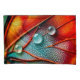Esta impresionante fotografía macro capta el detalle impresionante de una ala de mariposa adornada con brillantes caídas de agua. El ala muestra un espectacular degradado de color, pasando de rojos feroces y naranjas vibrantes a un turquesa fresco y apacible. Cada pequeña escala crea un intrincado patrón celular, maravillosamente magnificado por las gotas de agua cristalinas que descansan en la superficie como joyas preciosas. Esta imagen es una celebración de la delicada, vibrante y a menudo invisible belleza del mundo natural.