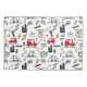 A playful, cartoon-style city pattern featuring buses, cars, helicopters, traffic lights, buildings, and fun doodle text like “Beep Beep,” “Wuz Up?” and “Go,” in bright red, yellow, blue, and black tones.