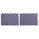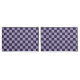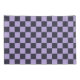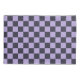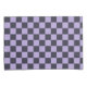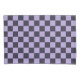A vibrant checkered pattern with alternating black and lavender squares creates a bold, symmetrical grid. The design is balanced and visually striking.
