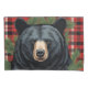 Un bello y majestuoso oso Oso Negro del Norte sobre un rústico fondo rojo, negro y blanco de manta. El oso con sus características fuertes y elegantes y su rica piel negra es el punto central de este diseño. La expresión del Oso transmite una sensación de confianza y tranquilidad que se suma al encanto rústico, contrastando con gusto con el fondo de rocas. El diseño de esta casa de campo destaca la belleza natural del oso y sería perfecto para una decoración de casa o cabaña.