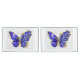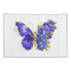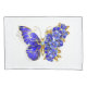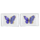 Joyería, azul, zafiro, mariposa de flor brillante con ala decorada con flores azules y preciosas con hojas doradas sobre fondo blanco.