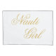 El Chica de Nauti Bad Buoy His Gold Script Nautical Pillow Funda presenta el divertido texto "Nauti Chica" y "Bad Buoy" en un elegante guión dorado sobre un fondo blanco. Un estupendo y divertido dormitorio con temática náutica. Diseñado por ©Evco Studio www.zazzle.com/store/evcostudio