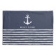 Este único funda de almohadas náuticas con rayas azul marino y blanco, anclaje y texto de plantilla fue diseñado para una elegante ropa de cama de yate. Escriba su nombre de barco o un nombre de familia para personalizarlo.