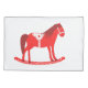 Esta impresionante funda de almohada de doble cara con motivos de Navidades presenta una imagen de arte digital de un lindo caballo de rock de estilo escandinavo. El caballo es rojo con un mané rojo oscuro, cola y pezuñas. El caballo amistoso sonríe. Tiene una silla blanca y riendas con motivos folclóricos escandinavos bonitos en la silla, incluyendo el sol, la luna y las estrellas y los corazones y flores. La base del mecedor es roja y está cubierta de hojas blancas de bonito. El diseño se inspiró en el caballo Dala sueco.