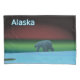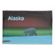 Un oso polar deambula por el hielo durante la larga noche polar; las auroras boreales en rojo y verde brillan a lo lejos. También aparece el texto que dice "Alaska" en azul brillante y blanco.