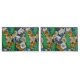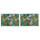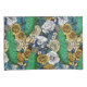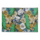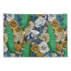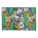 Patrón dibujado a mano con pavos reales y varios rosas sobre un fondo oscuro