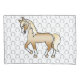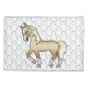 El original ilustracion personalizado de Destei de un lindo caballo palomino de color. El fondo tiene un patrón de herraduras grises.