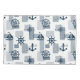 Diseño náutico de fondo azul y blanco con decoración de velero, brújula, ancla y rueda de vela