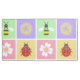 Las plazas rosadas, amarillas, violetas y verdes pasteles están adornadas con rodajas, flores de madera de palo, margaritas y abejas y bordeadas de un puntito blanco apretado para crear un divertido y dulce patrón al estilo de los parches de primavera.