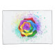Rosa grande y floreciente con pétalos de arco iris sobre fondo blanco, pintado con salpicaduras de pintura colorida y brillante. 3.ª