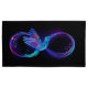 Símbolo de infinito violeta y brillante con colibrí azul sobre fondo negro. Neón.