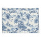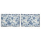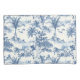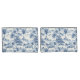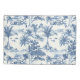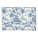 La imagen representa un patrón clásico de tela de Jouy, caracterizado por escenas detalladas en azul sobre un fondo blanco. Cuenta con paisajes tropicales con palmeras exuberantes, terrenos rocosos y cuerpos de agua serenos. Hay elementos como pequeñas cabañas, pájaros en vuelo e islas distantes que le confieren al diseño un ambiente idílico y tranquilo. El patrón es intrincado y evoca una sensación de elegancia tradicional y pastoral a menudo asociada con las artes decorativas francesas.