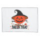 Celebra Halloween de manera espeluznante con esta obra de arte de la Trata de Calabaza con una calabaza super linda con un hacha de daga y un fantasma. La obra de arte lleva un gorra, añadiendo un aspecto de misterio a la figura fantasmal.