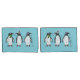 El ilustracion original de Destei de tres pingüinos festivos de Gentoo con coloridas luces Navidades con sus picos. Un pingüino lleva una bufanda verde, otro lleva protección para el oído morado y el tercer pingüino del medio lleva puesto un sombrero de Santa Claus rojo y blanco. El color de fondo es azul claro.