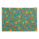 Seamless tropical pattern featuring stylized red and yellow striped leaves and clusters of yellow berries against a vibrant teal background.