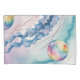 A watercolor-style illustration of a large pink and blue jellyfish with long flowing tentacles against a soft pastel background. The jellyfish has a translucent pink bell-shaped umbrella and pale blue tentacles with subtle ripples and waves. Four rainbow-colored bubbles float in the background, each showing a gradient of pink, yellow, and blue colors with a glossy, soap-like appearance. The background features a gentle gradient from light turquoise to pale purple, with soft brushstroke textures creating a dreamy underwater atmosphere. The illustration has a delicate, ethereal quality with subtle watercolor bleeds and drips around the edges of the composition. The tentacles of the jellyfish create graceful curves and waves as they trail behind the main body, rendered in varying shades of blue with pink undertones.
