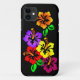 Patrón floral colorido de hibiscos tropicales en color púrpura, rojo, naranja, magenta y amarillo contra un fondo negro.