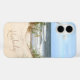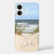 Estuche de teléfono tropical de temática playera con una foto de la orilla del mar con dunas de arena y hierbas marinas, con olas en el fondo y nombre del personalizable o texto de su elección.