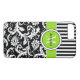 Este funda Funda-personalizado para iPhone 7, blanco y negro personalizado, tiene un amortiguador floral y un patrón de fondo rayado con una banda verde lima y blanca y círculo para añadir su nombre, iniciales, monograma u otro texto. ¡Este nuevo funda moderno y de moda hace una declaración de moda para el joven y moderno modistonista! Si necesita ayuda, envíe un correo electrónico a niteowlstudio@gmail.com.