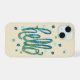Funda de teléfono adorable con la palabra "hola" con flores lindas. Ondas funky azules y verdes y flores pequeñas sobre un fondo de beige con puntos blancos.