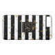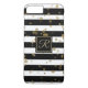 Moderno funda iPhone 7/8 Plus rayado en blanco y negro, con gráficos de puntos de tono dorado. Un área de texto cuadrado negro tiene un monograma de una sola letra. Personalice el monograma para adaptarlo a sus necesidades.