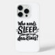 El estuche para iPhone tiene un elegante fondo negro, proporcionando un lienzo nítido y minimalista para el texto en negrita blanco. La cita "Quién necesita dormir" está escrita en un llamativo y lúdico tipo de letra a lo largo de la mitad superior del funda, con la palabra "dormir" enfatizada en un estilo de letra más grande y peculiar, como si estuviera ligeramente inclinado o en cursiva para un mayor toque. Debajo, la frase "cuando tienes plazos" está escrita a mano en un tipo de letra más informal para capturar el apresuramiento y el caos de cumplir los plazos. Para complementar el texto, un pequeño gráfico de una taza de café de aspecto cansado o un reloj despertador que muestra la medianoche se coloca cerca de la esquina inferior, añadiendo un elemento visual humorístico. El diseño es muy divertido y limpio, con suficiente espacio en blanco para mantener la disposición crujiente y sencilla. El esquema general de color blanco y negro hace que el funda sea elegante y versátil, perfecto para el uso diario, mientras que la cita le aporta un toque de humor y relación a cualquiera que equilibre la vida, el trabajo y los plazos. El funda se siente moderno y juguetón, lo que lo convierte en el inicio ideal de la conversación.