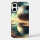 Una enorme esfera metálica se cierne sobre un paisaje reflexivo y árido, creando una escena espeluznante e hipnotizante. El cielo está lleno de nubes vibrantes y giratorias, que proyectan dramáticas reflexiones en el agua de abajo.