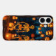 Diseño lúdico de Halloween de esqueletos de calabaza bailando bajo linternas brillantes. Una colorida y divertida obra de arte espeluznante para las fiestas.
