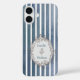 El diseño de estilo vintage se basa en las franjas acuáticas de Moire, centradas en el medallón floral barroco. Personalizado con los nombres (primero y apellido o nombre de una pareja). Las rayas azules grises y el aspecto vintage crean una moda, un regalo personal.