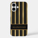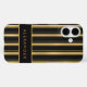 Esta carcasa de teléfono celular presenta un diseño elegante y elegante con rayas de oro verticales sobre un fondo negro, dándole un aspecto refinado y lujoso. Una banda negra horizontal a lo largo del centro muestra el nombre de los propietarios en letras en negrita y doradas en mayúsculas, añadiendo un toque personalizado y de primera calidad. La estética general es moderna, sofisticada y de diseño, ideal para quien valora tanto la moda como la función.