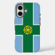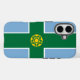 iPhone 14 Funda con diseño con bandera del condado histórico de Derbyshire, en Inglaterra, Gran Bretaña; bandera azul con cruz verde y un rosa Tudor de oro en el centro