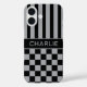 Customize this iPhone 16 case with black and gray stripes on the top half and black and gray checkered pattern on the bottom half with your name in a modern CAP font in the middle in gray on black. It's preppy, trendy and bold - definitely cool!