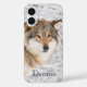 Tema animal y naturaleza. ¿Cazando lobo en un vigilante y guardia en un bosque invernal esperando por su presa, o tal vez buscándote...? Un animal hermoso y orgulloso con piel gruesa en marrón, blanco y negro. Personalizar y añadir un nombre, letras negras.