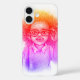 Chica con gafas, estuche para iPhone, estuche de teléfono colorido con un dibujo artístico de un joven chica con gafas grandes y pelo rizado. Ella está ajustando sus lentes con una mano y tiene una sonrisa suave. El dibujo está sombreado con un degradado de tonos cálidos rojo, naranja, rosa y violeta, lo que le da un ambiente alegre y lúdico.