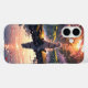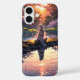 Hermoso estuche de teléfono de anime con un chica sereno junto a un río al atardecer con pétalos de flores de cerezo.