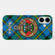 Insignia de escudo del clan MacLeod rodeada por una correa y hebilla sobre el escote de caza verde. Texto personalizado.