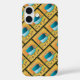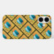 Este vibrante diseño de café muestra una taza verde azulada de dos tonos contra un sorprendente fondo dorado y naranja, acentuado por un audaz borde de diamante negro y rojo. ... Arte Qzik