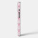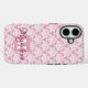 Este estuche para iPhone bonito presenta un diseño femenino con un patrón adamascado blanco sobre un rosa polvoriento o un fondo de color rosa mudo. Hay un nombre inicial monogramado así como un nombre personalizado.
